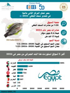 حافظت مصر على مكانتها العالمية في صادرات سمك البلطي الطازج أو المبرد (باستثناء الأحشاء وشرائح الأسماك) البند الجمركي (030271)، بحصة سوقية بلغت 20% من صادرات العالم، وبقيمة 9.4 مليون دولار وكمية 17 ألف طن في عام 2024، لتحتل المركز الثاني عالميًا.
