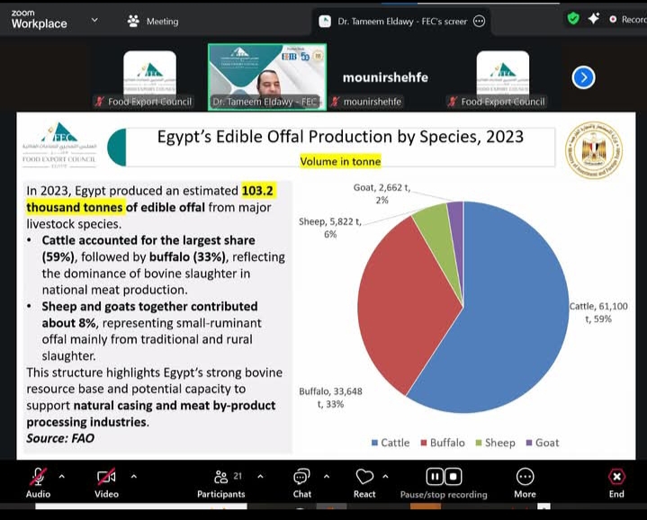 وفي عام 2023، قُدّر إنتاج مصر من المخلفات الحيوانية الصالحة للأكل بنحو 103.2 ألف طن، من الأنواع الحيوانية الرئيسية مثل الأبقار والجاموس والأغنام والماعز، وشكلت الأبقار الحصة الأكبر بنسبة 59%، تليها الجاموس بنسبة 33%، فيما ساهمت الأغنام والماعز بنحو 8% مجتمعتين، وتبرز هذه البنية قاعدة قوية للموارد البقرية في مصر وقدرة محتملة لدعم صناعات الأغلفة الطبيعية ومعالجة المنتجات الثانوية للحوم.